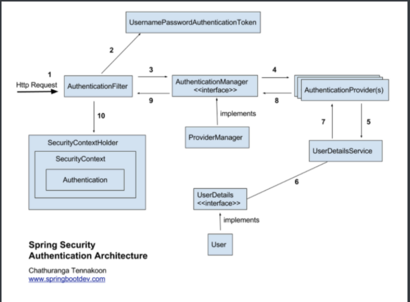 | UsernamePasswordAuthenticationToken을 AuthenticationManager의 구현체인 ProviderManager에게 전달 | AuthenticationManager 굳이 직접 구현 X |