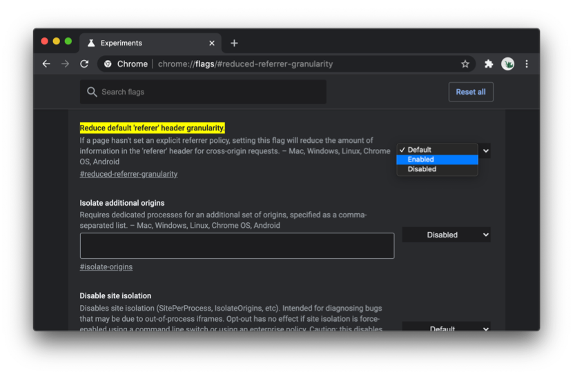 크롬에서 기본 레퍼러 정책을 strict-origin-when-cross-origin 으로 활성화시키면, 정책 변화를 테스트할 수 있다. ( chrome://flags/#reduced-referrer-granularity )
