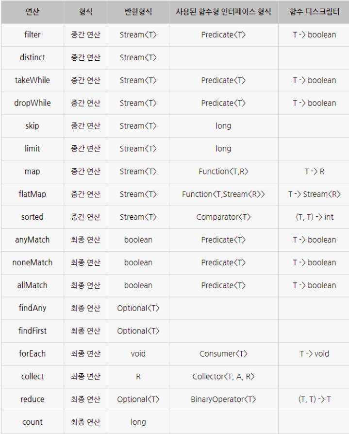 - filter : Predicate(boolean을 반환하는 함수)를 인수로 받아서 Predicate와 일치하는 모든 요소를 포함하는 Stream을 반환합니다.