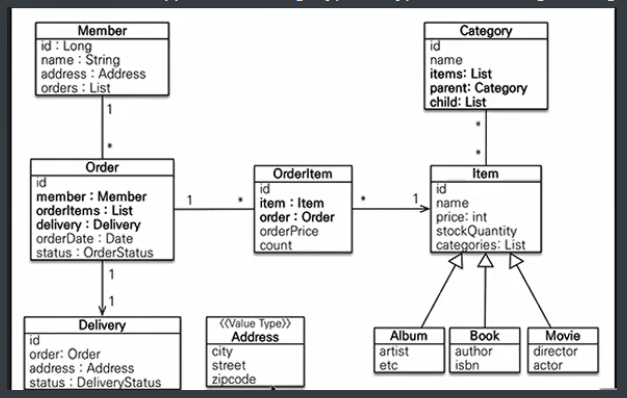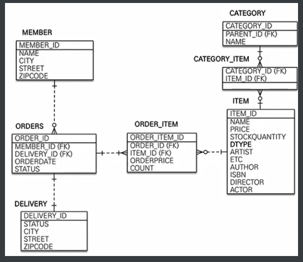 - 회원 - 주문 : 다대일 양방향 -> 주인관계 정해야함 -> 주문이 외래키 보유하므로 주문