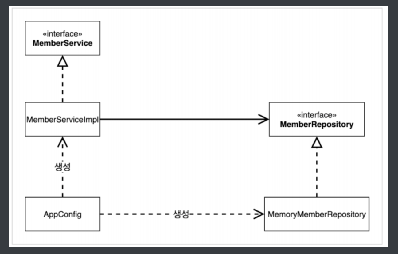 - appConfig 객체는 memoryMemberRepository 객체를 생성하고 그 참조값을 memberServiceImpl 을 생성하면서 생성자로 전달한다.